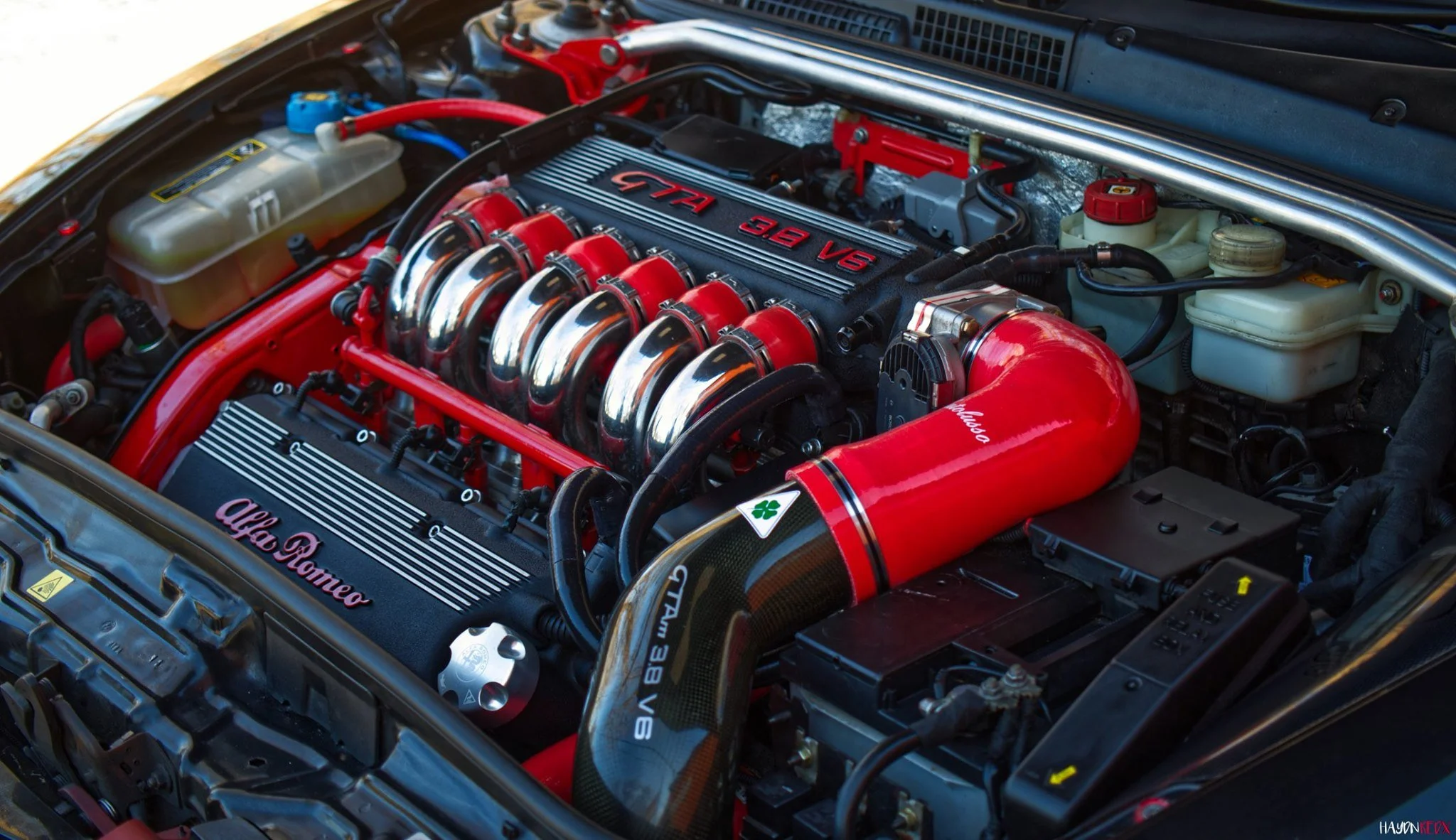 As you can see, it didn’t stay stock for long, with the essential Q2 differential, Eibach ARBs, KW V3s and a personalised reg (E11 GTA) amongst the first modifications to be fitted. Since then it’s been a nonstop quest for aesthetic and performance improvements whilst finding somewhere to channel my compulsions and pocket money. At this point it’s only fair to acknowledge the contribution of Ned Kirkham from Autolusso, who has been fair and tireless in his support for the development of this car and 147/156 GTAs in general. The signature modification is a rebored Autolusso 3.8 V6 Busso coupled to an SCS Delta ECU which arms this lightened 1300kg (reduced by 60kg) GTAm with 330 bhp (increased by 80bhp). These figures give the car a new power to weight ration of 253bhp per ton versus the standard 183bhp per ton and explains why I’ve taken the liberty of adding a GTAm badge at the rear.