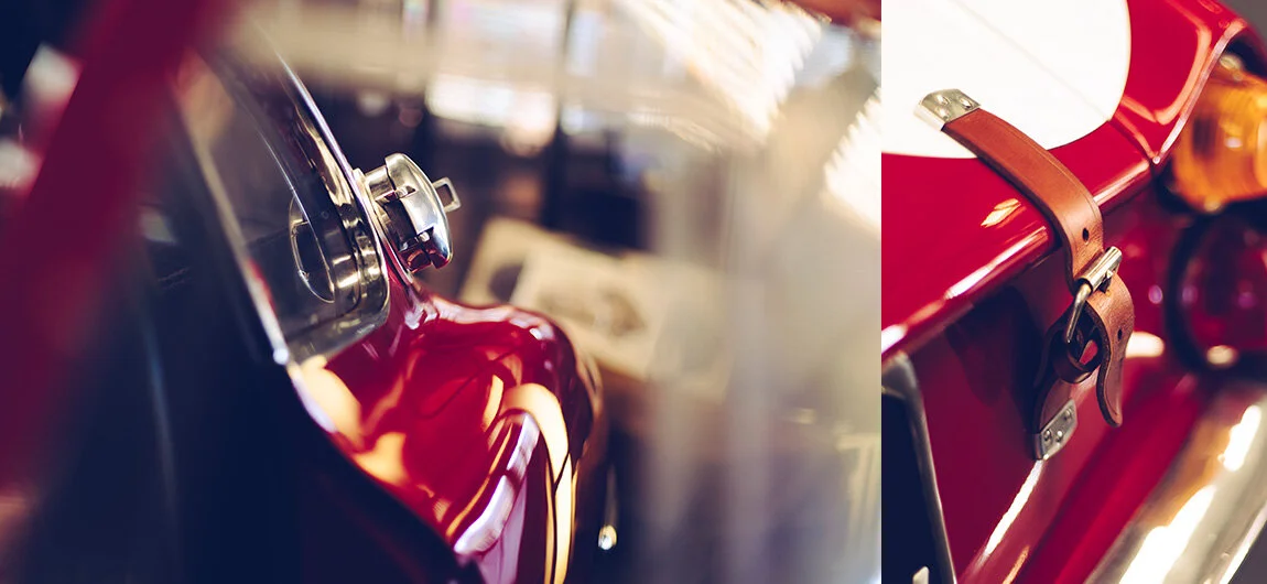 It is a competition car. With tow hooks, a higher ride height than usual, a roll cage and plexiglas side windows. It does without the front bumper, giving her a bit of the low nose look. The aluminium fuel cap adds a gorgeous detail to the left flank, while the red fire extinguisher seems colour coded to the painted dash. And you could be forgiven for believing that those leather straps are on just for decoration. Every detail has a tactile dimension to it. It works. But it also delights. It's a very Italian way to interpret the form follows function mantra, one that makes you wonder if there really is any difference at all between the two. Which brings our story full circle.